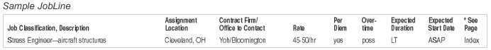 What is a JobLine? JobLines are line listings published in C.E. Weekly (our print magazine). They are listed alphabetically by job description, along with the assignment location, rate, per diem, amount of overtime, expected duration and start date. JobLines can be placed for as long as you choose, and Joblines are also posted at ContractJobHunter.com (in a searchable database) for the same length of time they appear in C.E. Weekly. Maximum length of job description is 55 characters.